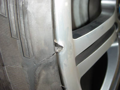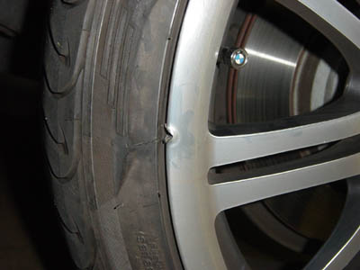 When I recapped my track day experience I forgot to tell about my missing tow hook! Since it had been pouring the whole day previous to the track event all the dust surrounding Buttonwillow turned to mud. An off track excursion meant that you would most likely get stuck in the mud, which quite a few people succeeded in doing. In order to expedite the process of freeing cars from the mud everyone was asked to have their tow hooks ready. I went scavenging in my trunk to find my tow hook, but alas it was missing! The following picture illustrates what I saw... The M3 does not come with a tow hook in the standard BMW trunk tool kit because it gets a larger tow hook. The tow hook should have been in the allocated space in the styrofoam next to the mobility kit. However when I looked the space was empty. The logical explanation is that the body shop must have jacked my tow hook! I feel rather naked without the tow hook so hopefully I will acquire one soon. I used my internet searching skills to get the part number so I can order a replacement. Now on top of everything it seems that I am really having trouble with wheels and tires lately. Yesterday I had one of those days where I couldn't seem to do anything correctly. For instance a task as simple as pulling into my parking garage became difficult. There is a gate on my parking garage. It had been on a bit of the fritz recently so I think the maintenance people did a few adjustments. Apparently they decided to shorten the length of time that the gate remains open. I usually wait for the gate to open a little ways away from the entrance. It helps in case someone decides to leave at the time I am entering. Then I can let the person exiting through before I enter because there is only space for one car inside of the entrance. I pulled forward to pass through once the gate opened. When got partially through the gate it decided it was going to begin closing. It does have a sensor that tells it not to close because there is a car in the way, but it only reacts after it has begun to close slightly. I continued passing through and hoped I wasn't too close to the gate. I almost made it completely through, but something grabbed one of my rear wheels. On post inspection is appears that the wheel got caught up on part of the gate track, but the damage is rather odd. See for yourself in the following pictures... It looks like I will be paying a visit to the wheel repairer at some point in the future. I seriously don't do these things just to have something to write here. They just tend to happen to me. I chalk it up to my awesome good luck. However all in all I can handle little annoying things going on with my car just fine. No matter what the car represents to me, it is still a material object. What really matters is that the little annoying things I have to deal with everyday aren't health problems. Therefore thus far the year 2005 has been a pretty good one.